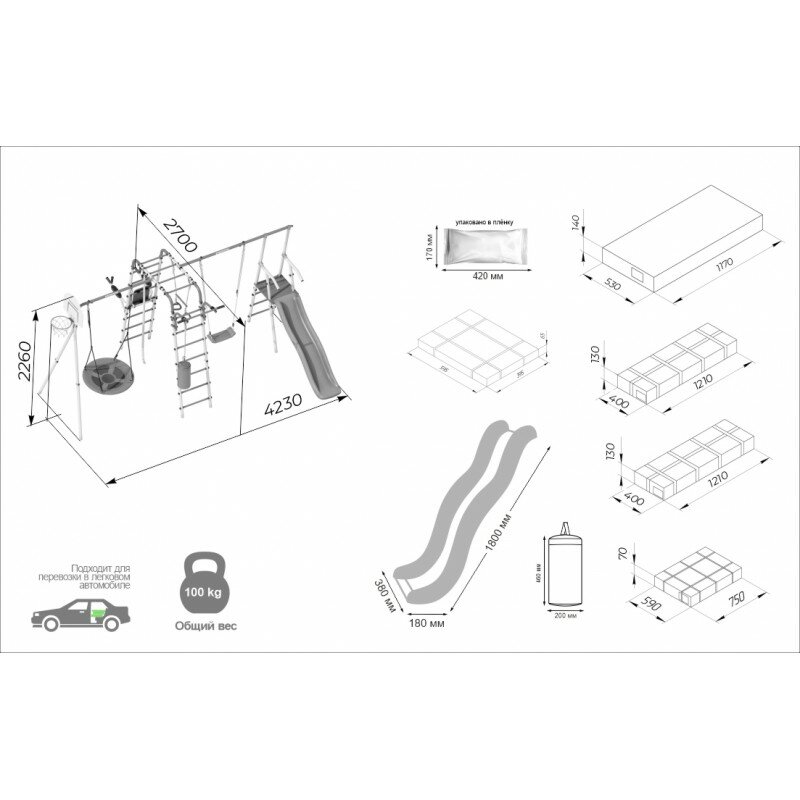 | В комплекте | баскетбольное кольцо, боксерская груша, гимнастические кольца, горка, канат, качели, рукоход, трапеция с кольцами, турник |