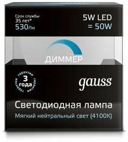 Лампа Gauss LED DIMM 101505205-D MR16 5W GU5.3 4100K диммируемая информация:
