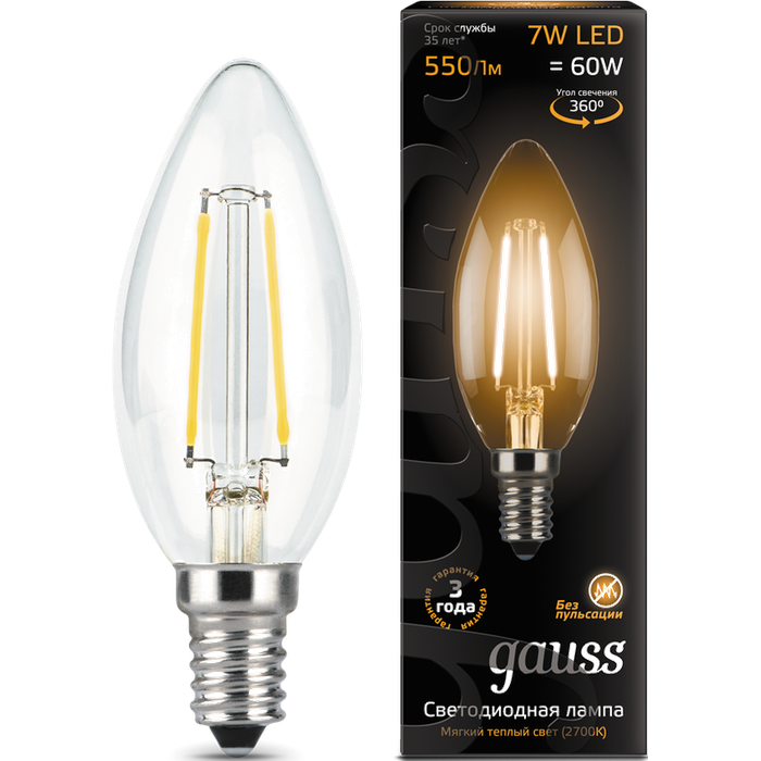 Лампа филам. Gauss 7Вт цок.:E14 свеча 220B 2700K св.свеч.бел.теп. C37 (упак.:10шт) (103801107) 3 337 ₽