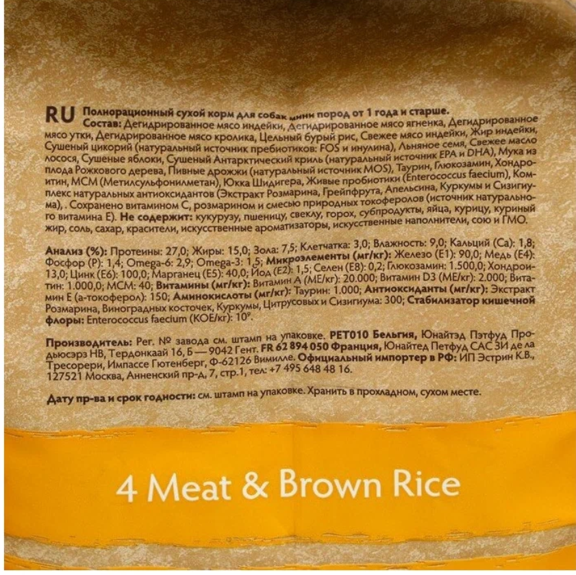 Корм сухой GRANDORF 4 Мяса для собак мини пород от 1 года.3 кг С пробиотиками, гипоаллергенный. информация: