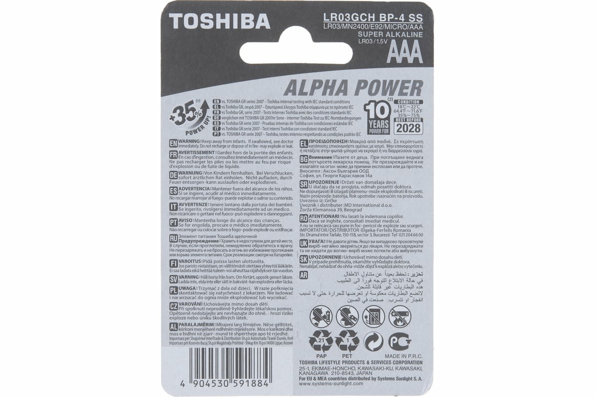 10 цен на Батарейка Lr03 Щелочная (Alkaline) Alpha Power Aaa 1.5V 4 Шт. Блистер TOSHIBA арт. LR03GCHBP4