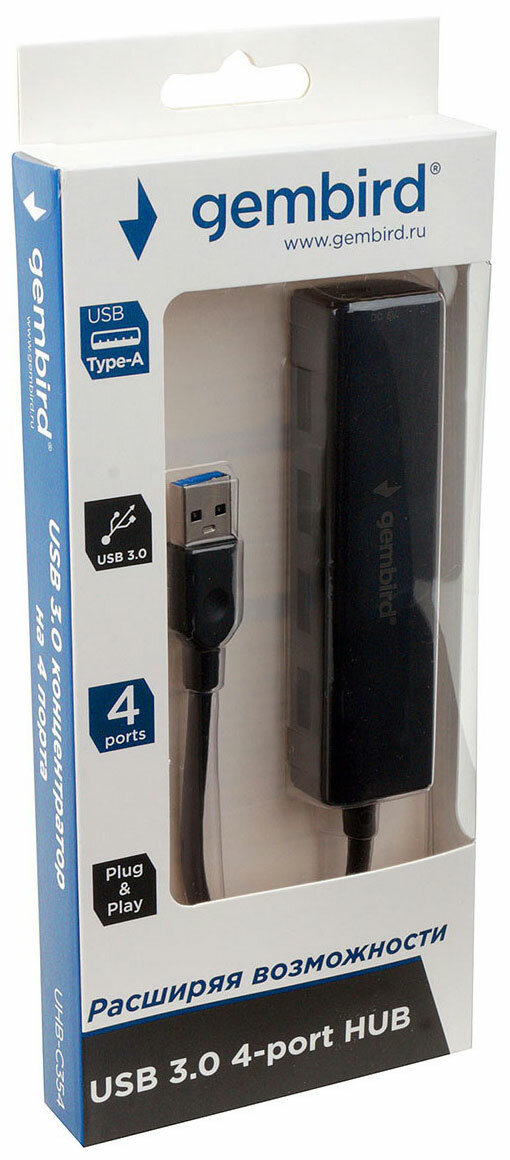 Концентратор USB 3.0 Gembird Uhb-c354, 4 порта, с доп питанием UHB-C354
