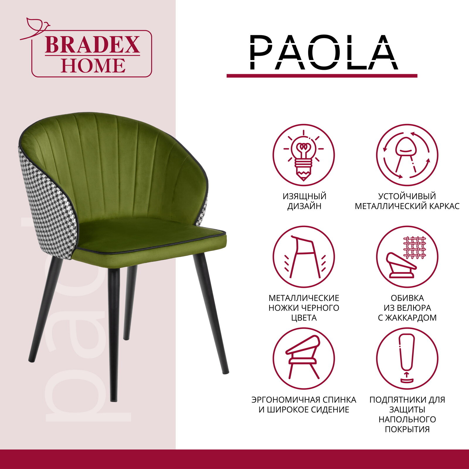 Стул обеденный Paola зеленый с жаккардом / Стулья для кухни / Стулья кухонные со спинкой / Мебель / Стул мягкий / Стул кресло / Стул обеденный информация: