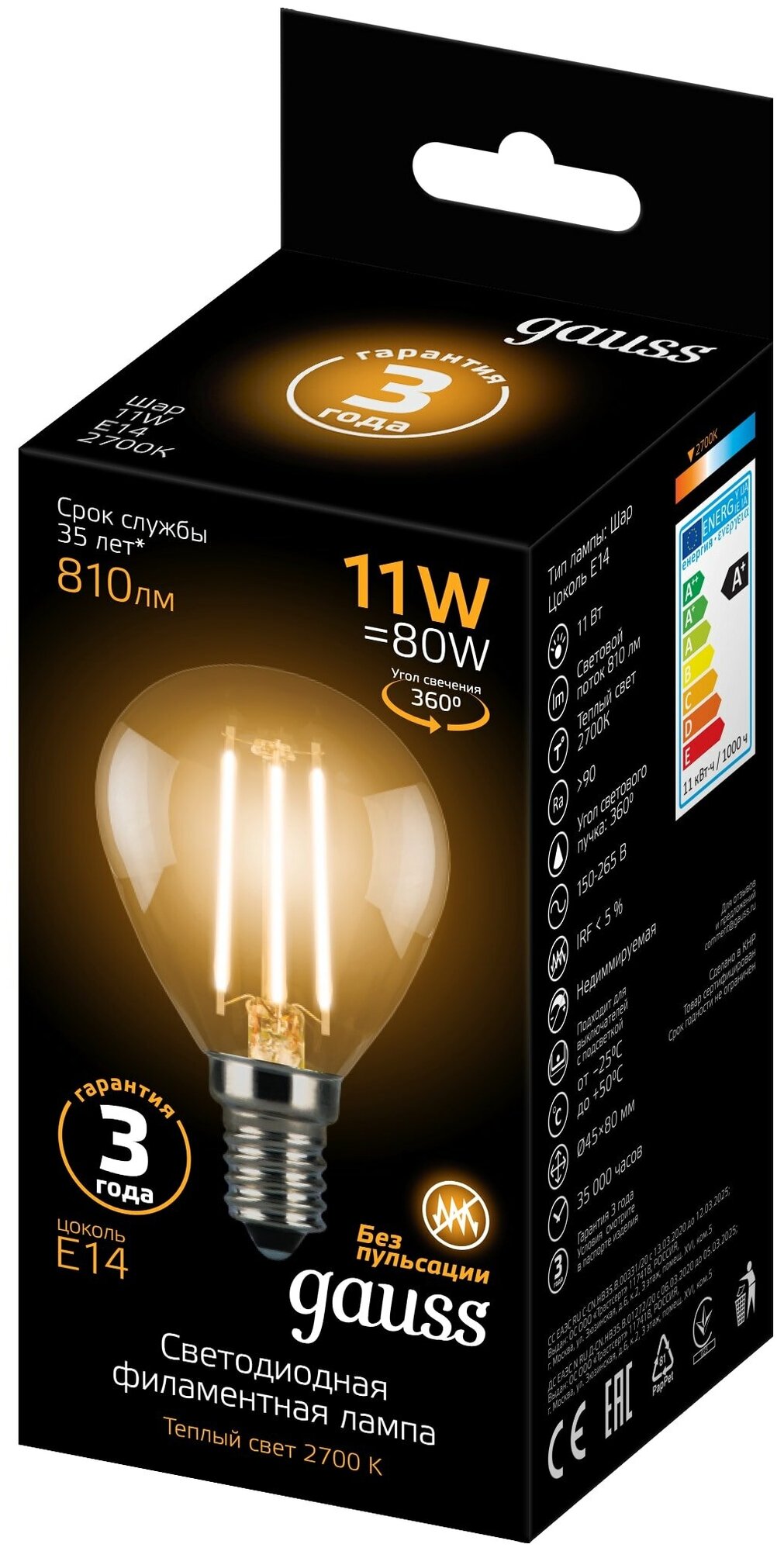 Отзывы на Светодиодная лампа Gauss LED Filament E14 11 Вт шар прозрачный 720 лм, тёплый белый свет