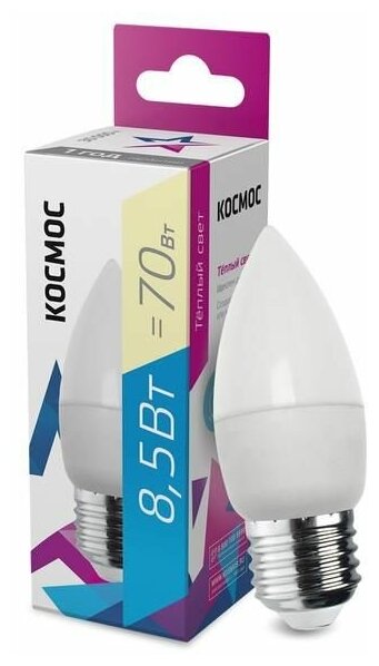 Светодиодная лампа Космос, свеча, 8.5 Вт, E27, 3000 K, LED8.5wCNE2730, теплый белый