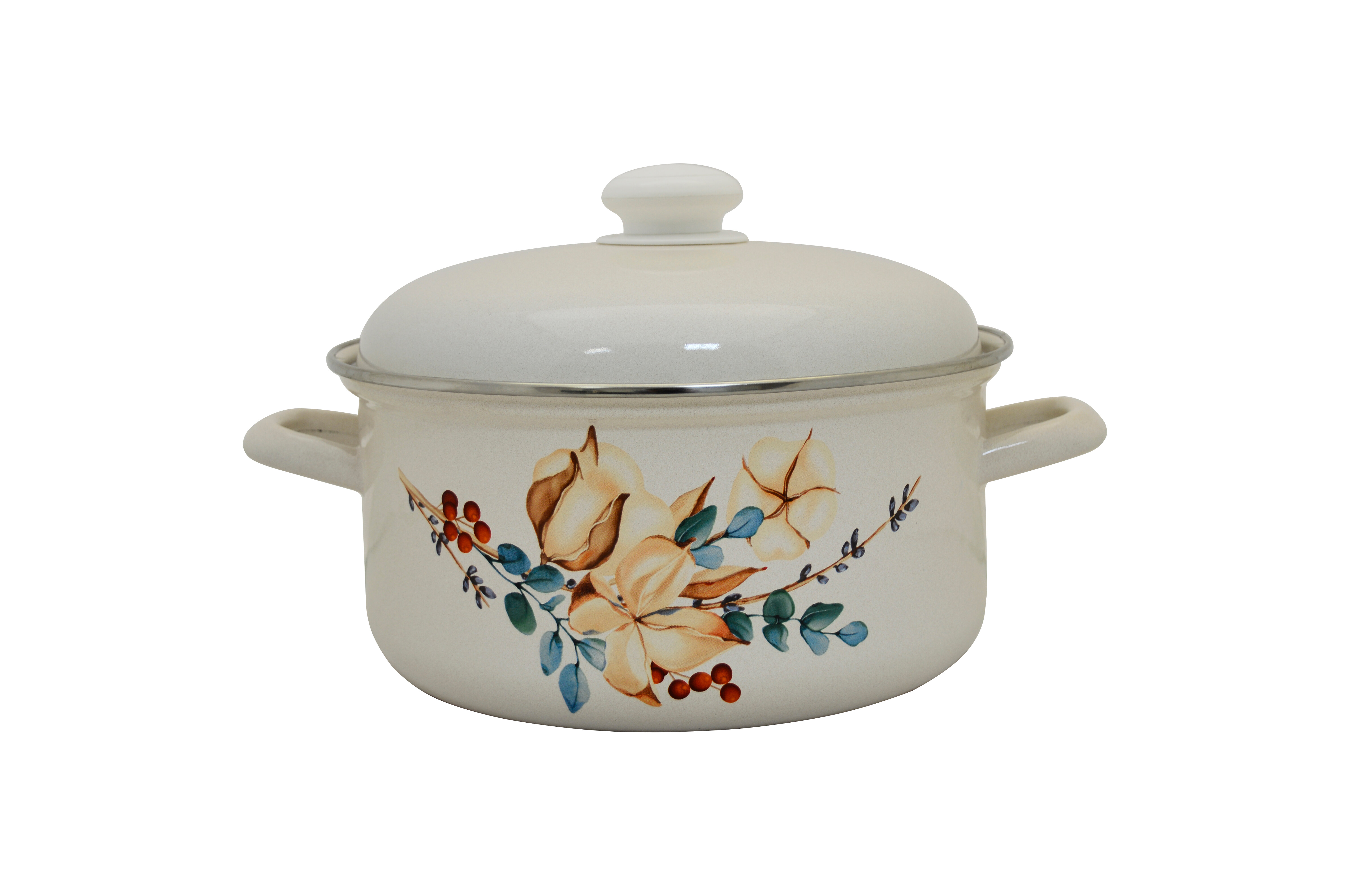 Кастрюля эмалированная 1,5 л с ободком белая с рисунком Фруктовая фантазия