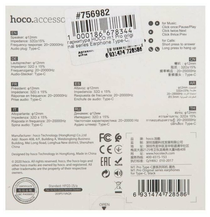 10 цен на Наушники с микрофоном HOCO M1 Pro, Type-c, черные