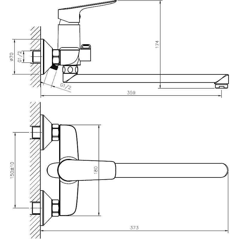 Смеситель на раковину настенный Эверест B46-350 с круглым поворотным изливом, кран-буксы 1/2", хром