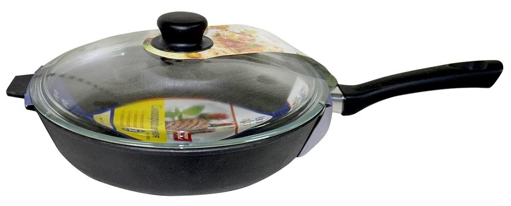 Отзывы на Сковорода Камская Посуда б8062 чугунная 280х60 с бакелитовой ручкой со стеклянной крышкой