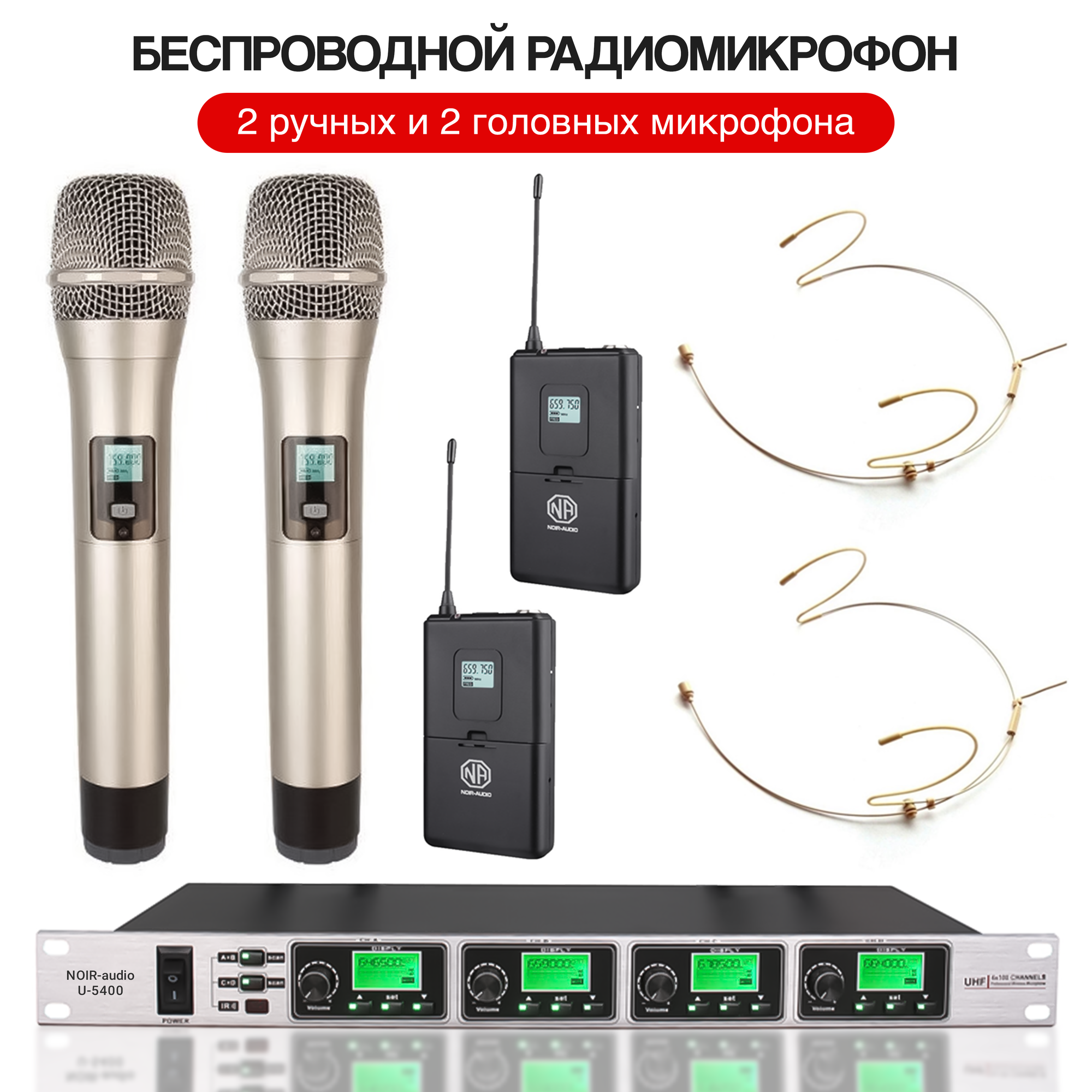 Беспроводной микрофон NOIR audio U-5400-HS4/H с 2-мя ручными и 2-мя головными микрофонами для вокала, караоке, речи информация: