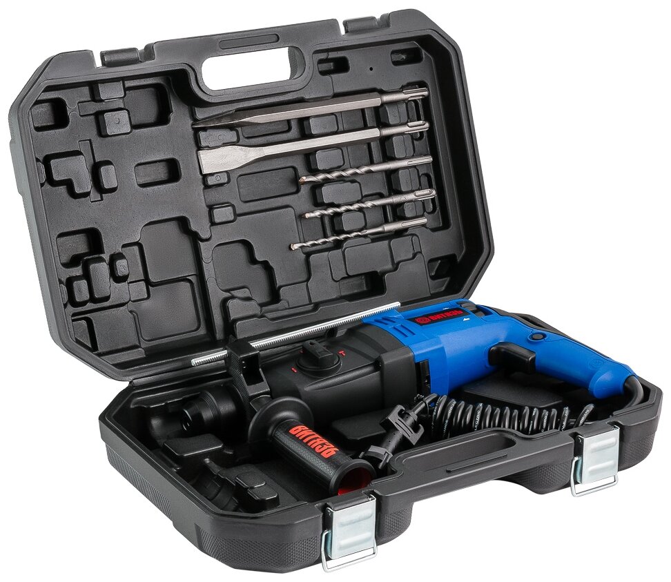 | Комплектация | дополнительная рукоятка, ограничитель глубины сверления, 3 SDS+ бура 8/10/12 мм, зубило, пика, кейс |