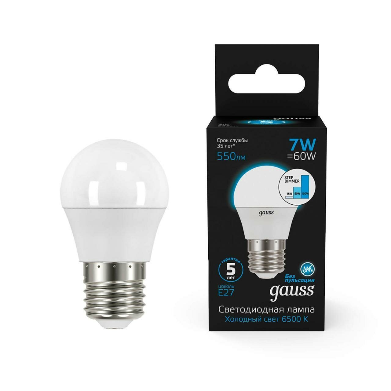 Отзывы на Лампа Gauss Шар 7W 550lm 6500K Е27 шаговое диммирование LED 1/10/100 105102307-S