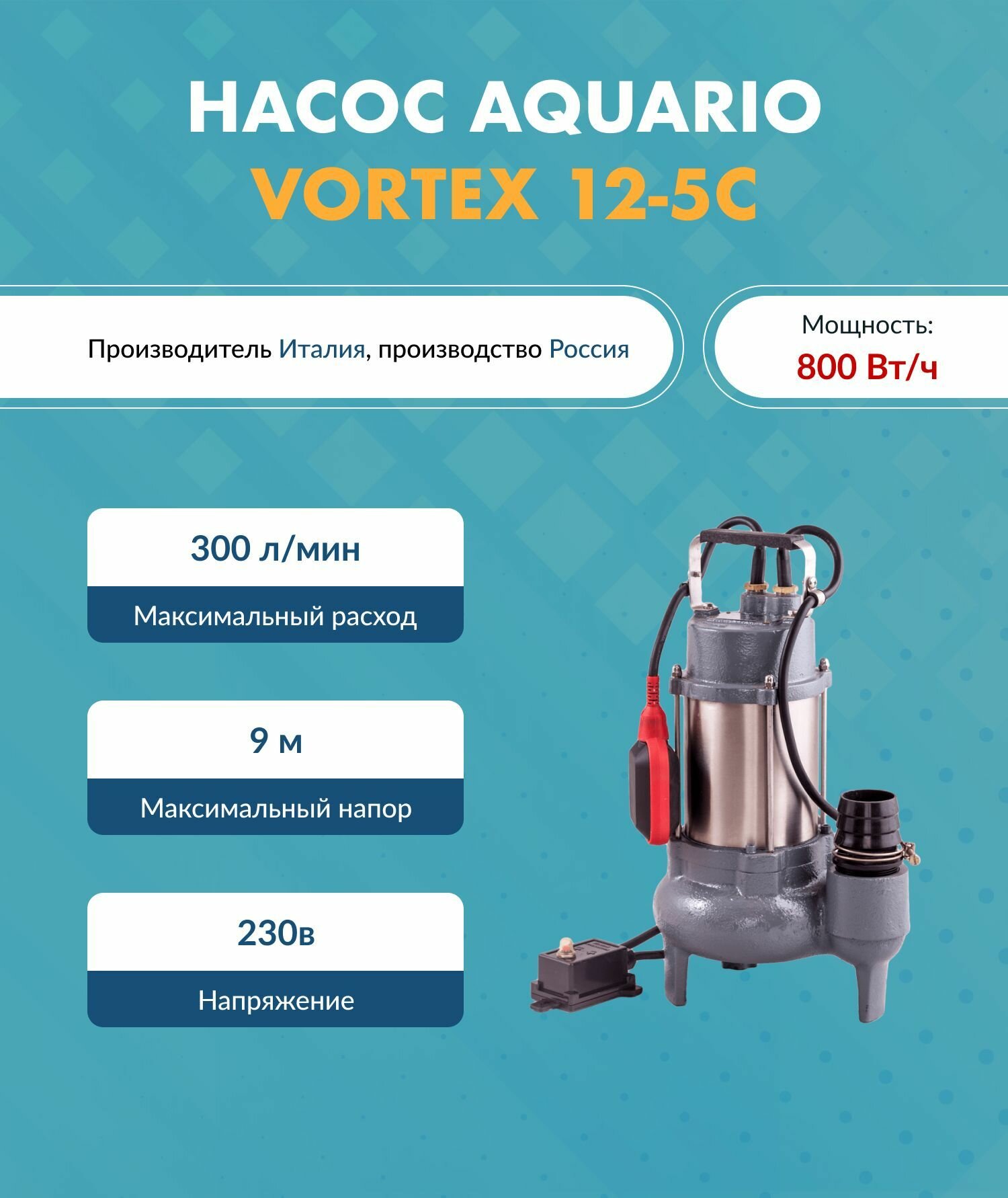 Дренажный насос Aquario (Акварио) VORTEX 12-5C (H-9 м. Q-300 л/мин P1-800 Вт) информация: