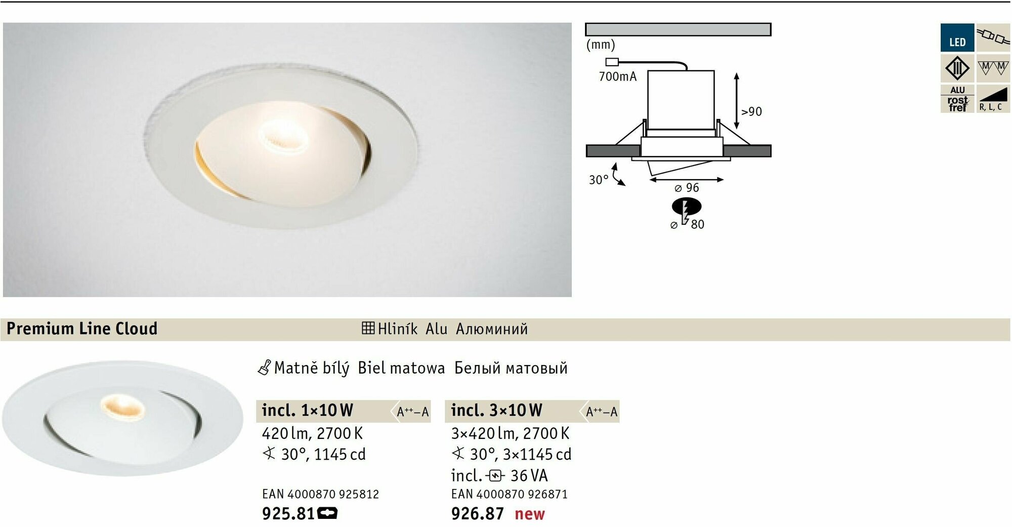 Светильник встраиваемый Paulmann Premium Line Cloud D96мм 10Вт 420Лм 2700К LED 36Va/230В Белый матовый Алюминий Набор 3шт. 92687 информация: