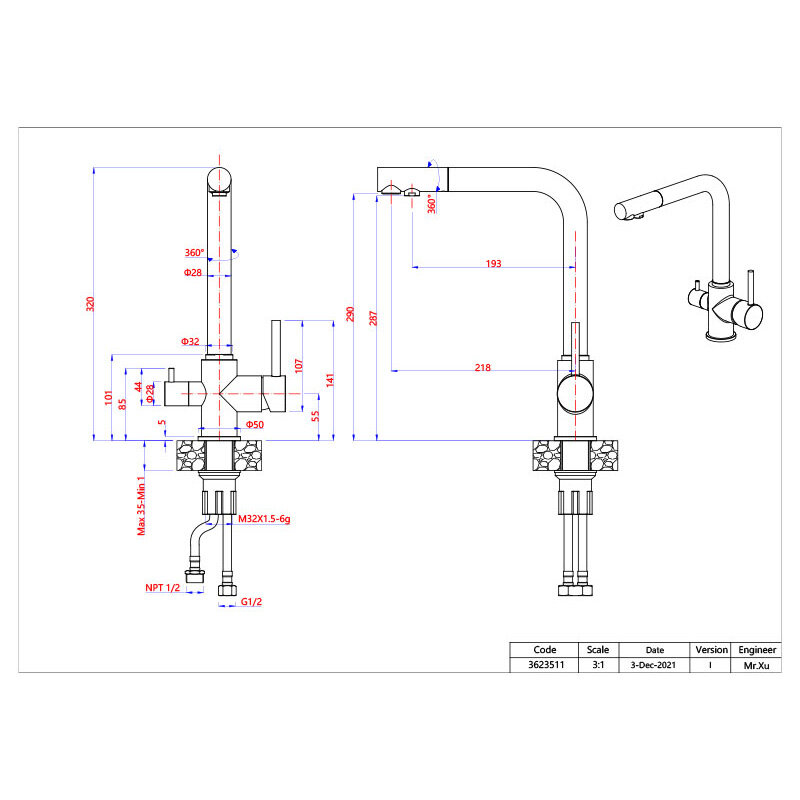 Смеситель для кухни с подключением к фильтру с питьевой водой из нержавеющей стали SUS304 Calorie CAL50116-3