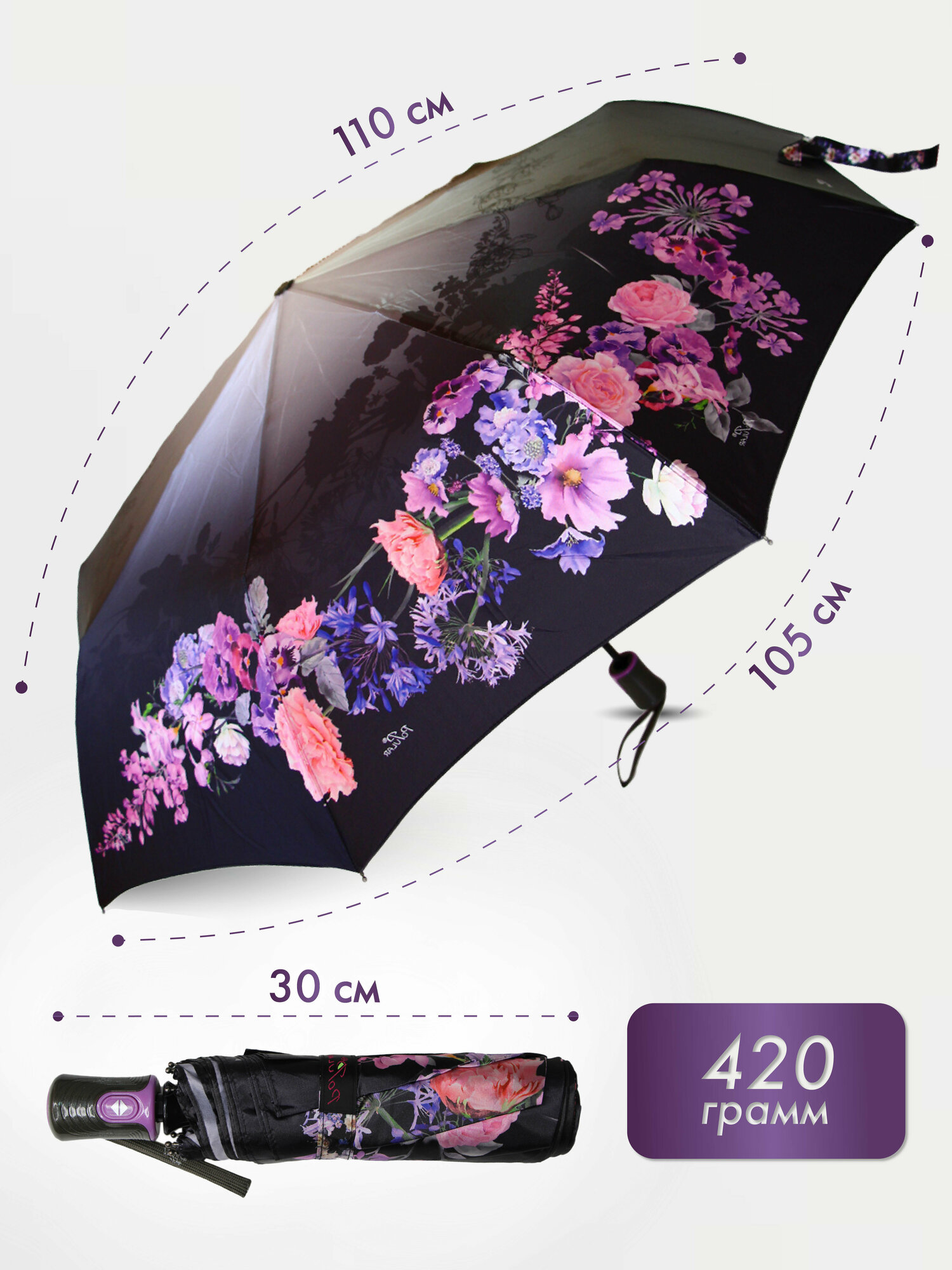 Женский зонт Popular umbrella 1290/черный,аметистовый