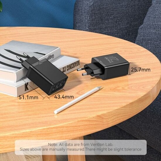 Vention 3-port USB(C+C+A) GaN Charger(65W/30W/30W) EU-Plug Black