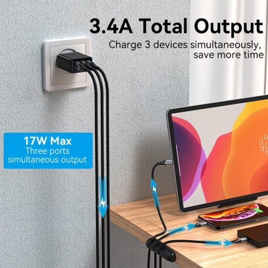Сетевое зарядное устройство Vention на 3 порта USB 2.4A Черный информация: