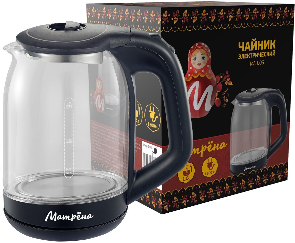 Матрена МА-006 чайник электрический дисковый, 1.8л, 1500Вт, стекло, черный