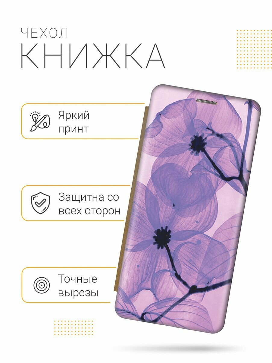 Чехол-книжка на Honor 20 Lite / 20s / Huawei P30 Lite / Хуавей П30 Лайт / Хонор 20 Лайт / 20s c принтом "Цветы в сиреневом" золотистый информация: