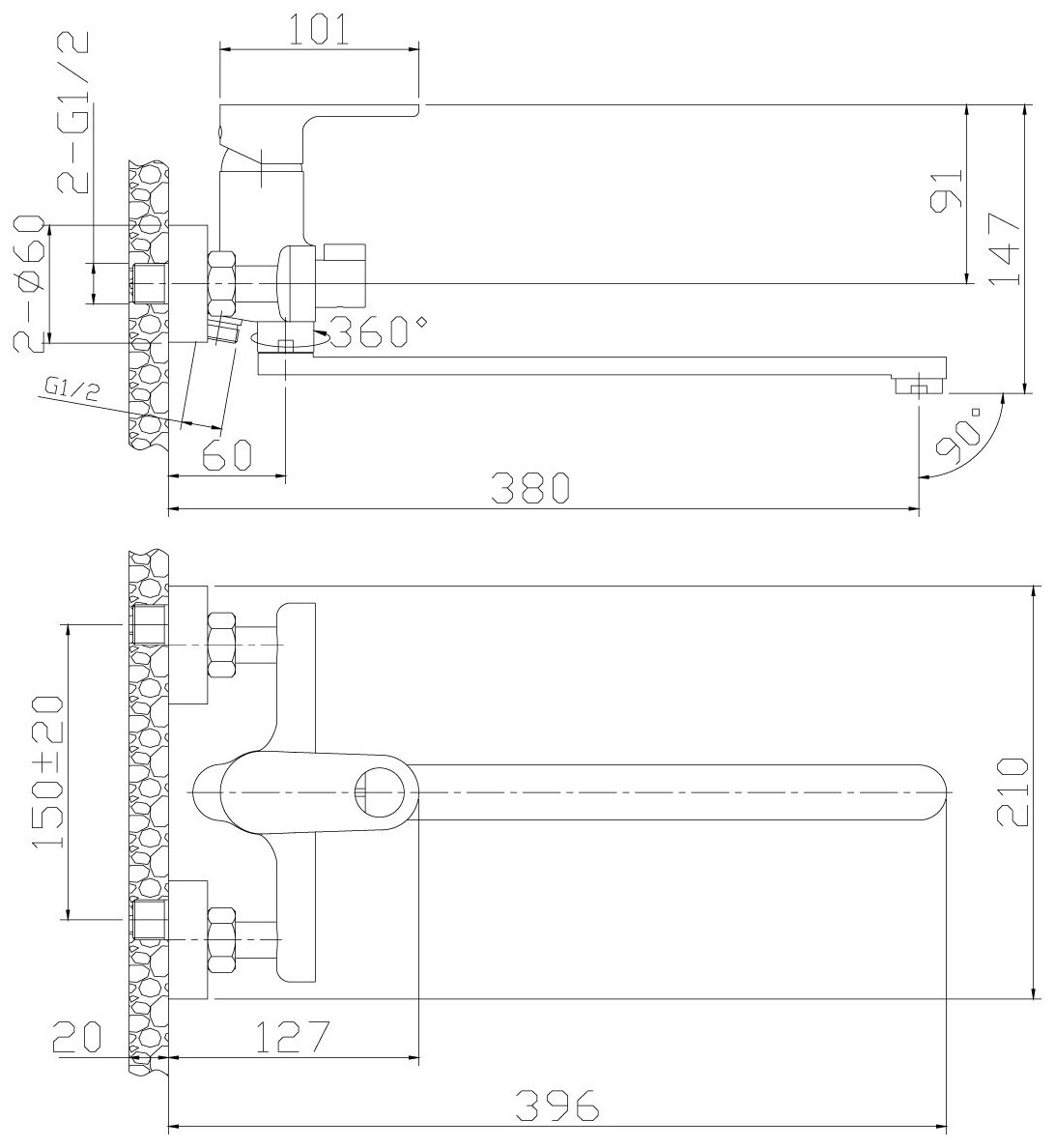Смеситель на раковину настенный Эверест B46-350 с круглым поворотным изливом, кран-буксы 1/2", хром