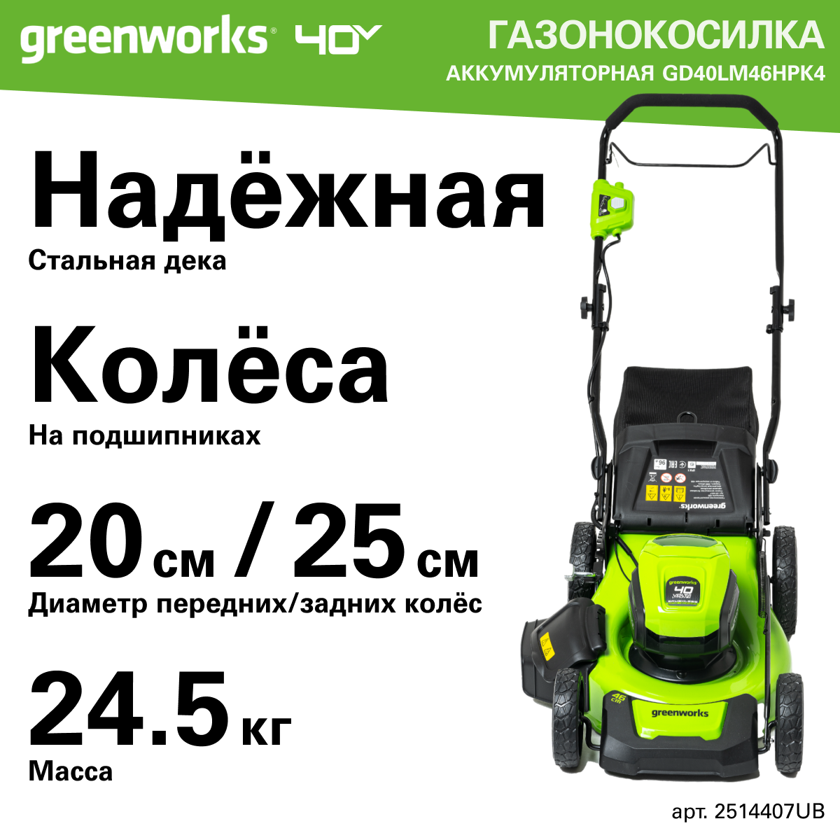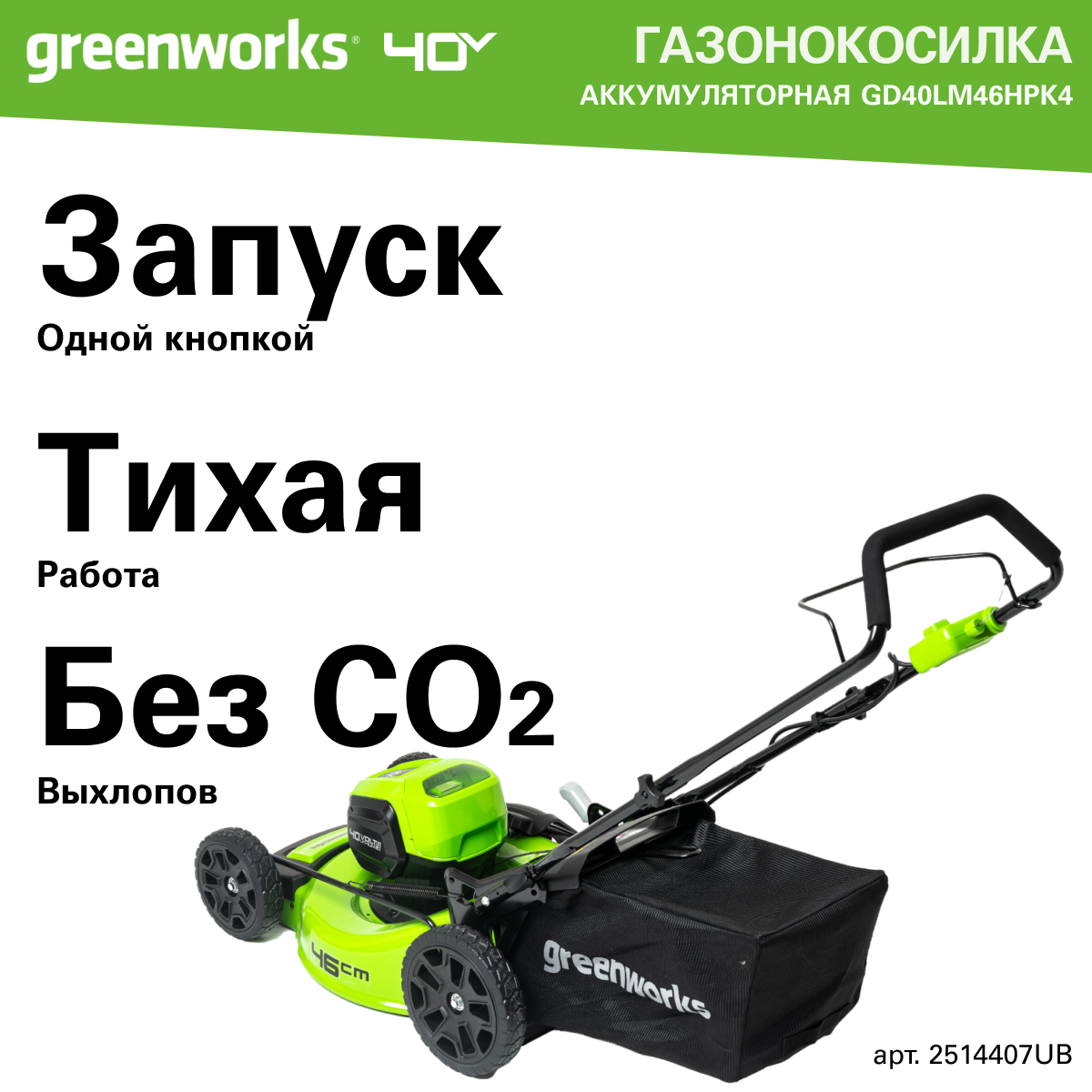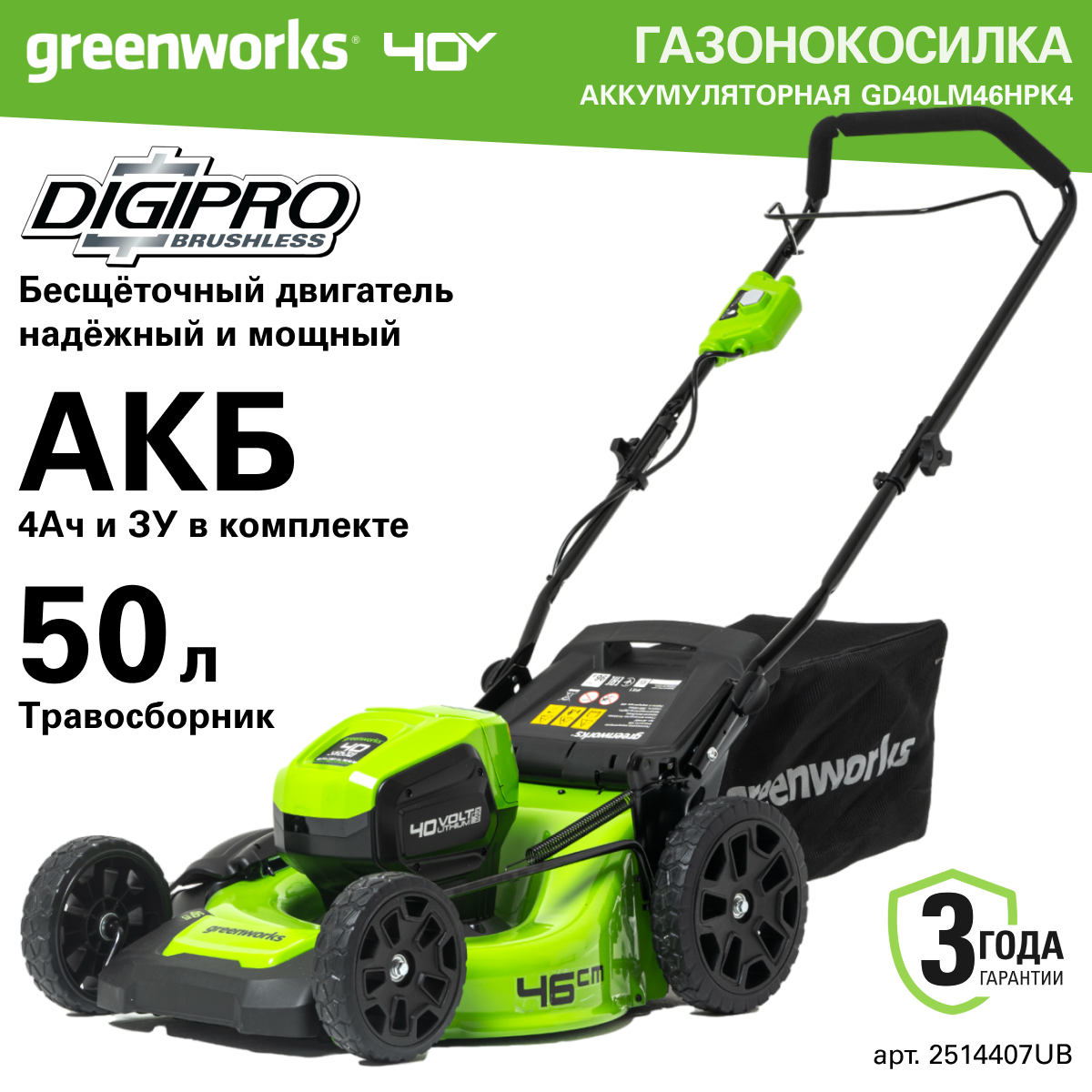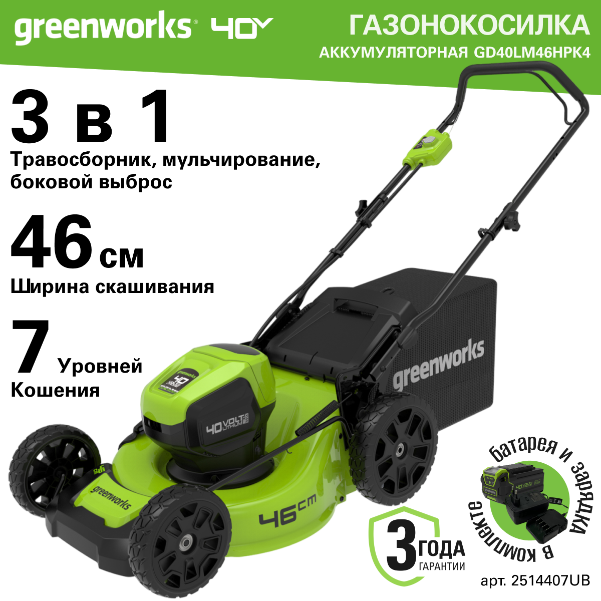 Газонокосилка аккумуляторная Greenworks Арт. 2514407UB, 40V, 46 см, бесщеточная, c 1хАКБ 4 Ач и ЗУ информация: