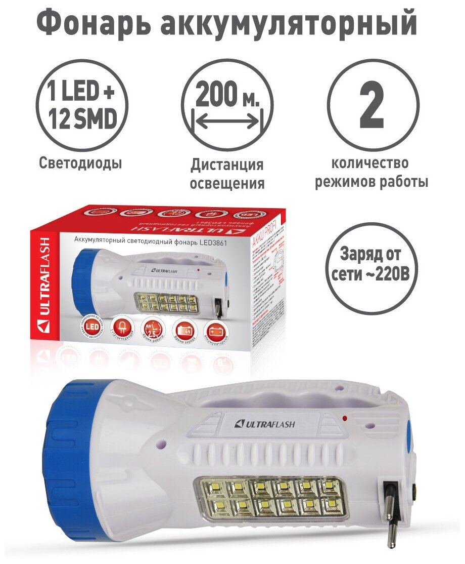 Фонарь аккумуляторный LED3861 LED + 12SMD 1Вт 2 режима 220В аккум. SLA пластик. бел. (кор.) Ultraflash 14256 информация:
