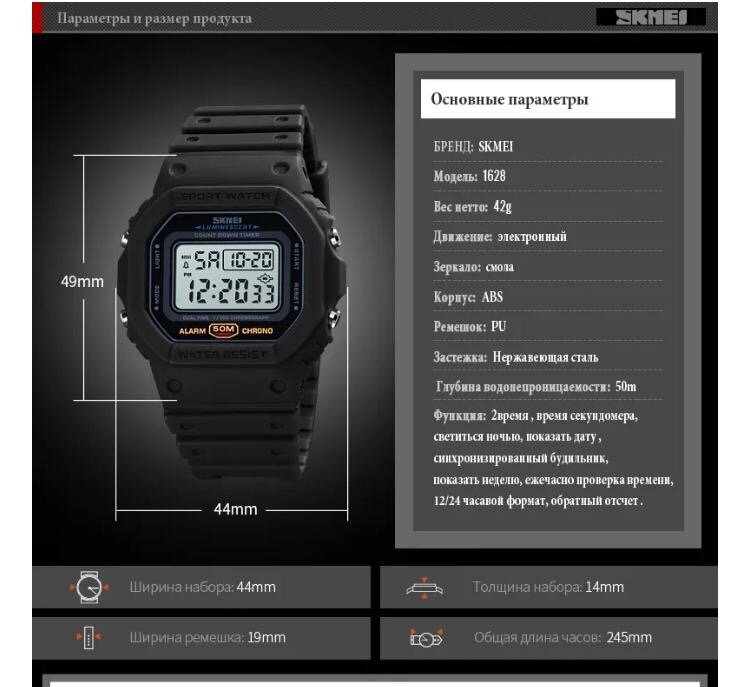 Часы наручные Skmei 1628 black Ударопрочные, водонепроницаемые, с секундомером, таймером, будильником