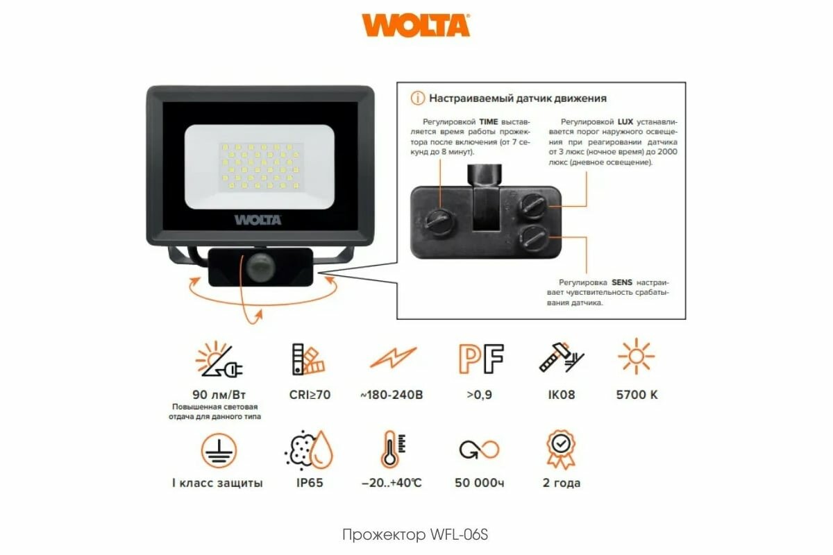 Прожектор светодиодный Wolta WFL-06s с датчиком, 10Вт, 5700K, 900Лм, IP65
