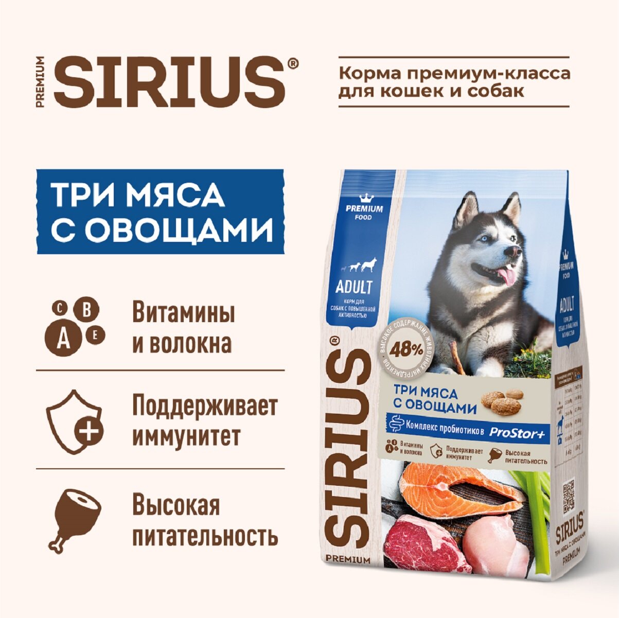 Сухой корм SIRIUS PREMIUM, Сириус для собак с повышенной активностью, три мяса с овощами, 2 кг