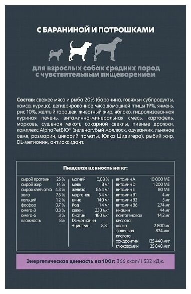 AlphaPet Superpremium сухой корм для взрослых собак средних пород с чувствительным пищеварением Баранина и потрошки, 2 кг. информация: