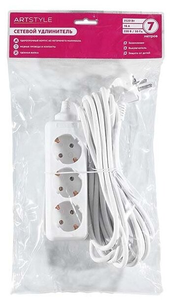 ARTSTYLE Сетевой удлинитель CL-C37GW белый, 3 гнезда, длина провода 7м, 220В, 16А, с заземлением, без выключателя 790 ₽