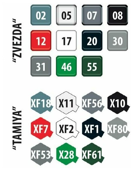 | Комплектация | сборная модель / клей / кисточка / набор красок для покраски: АКР-05 серебро 05/рзл.(5мл) / АКР-08 вороненая сталь 08/рзл.(5мл) / АКР-17 белая 17/рзл.(5мл) / АКР-20 черная 20/рзл.(5мл) |