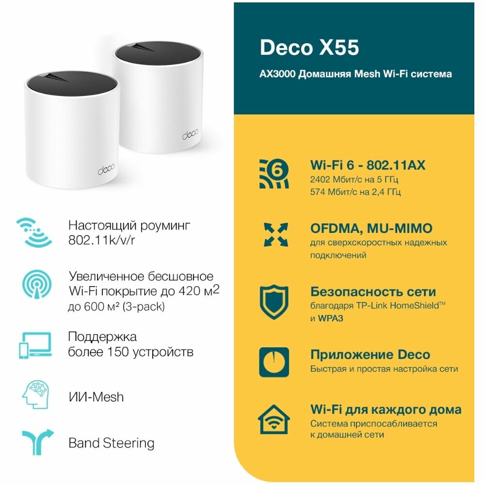Беспроводной маршрутизатор TP-LINK Whole-Home Mesh Deco X55 Wi-Fi 6 AX3000 2.4ГГц и 5ГГц, 2xLAN (2-pack) информация: