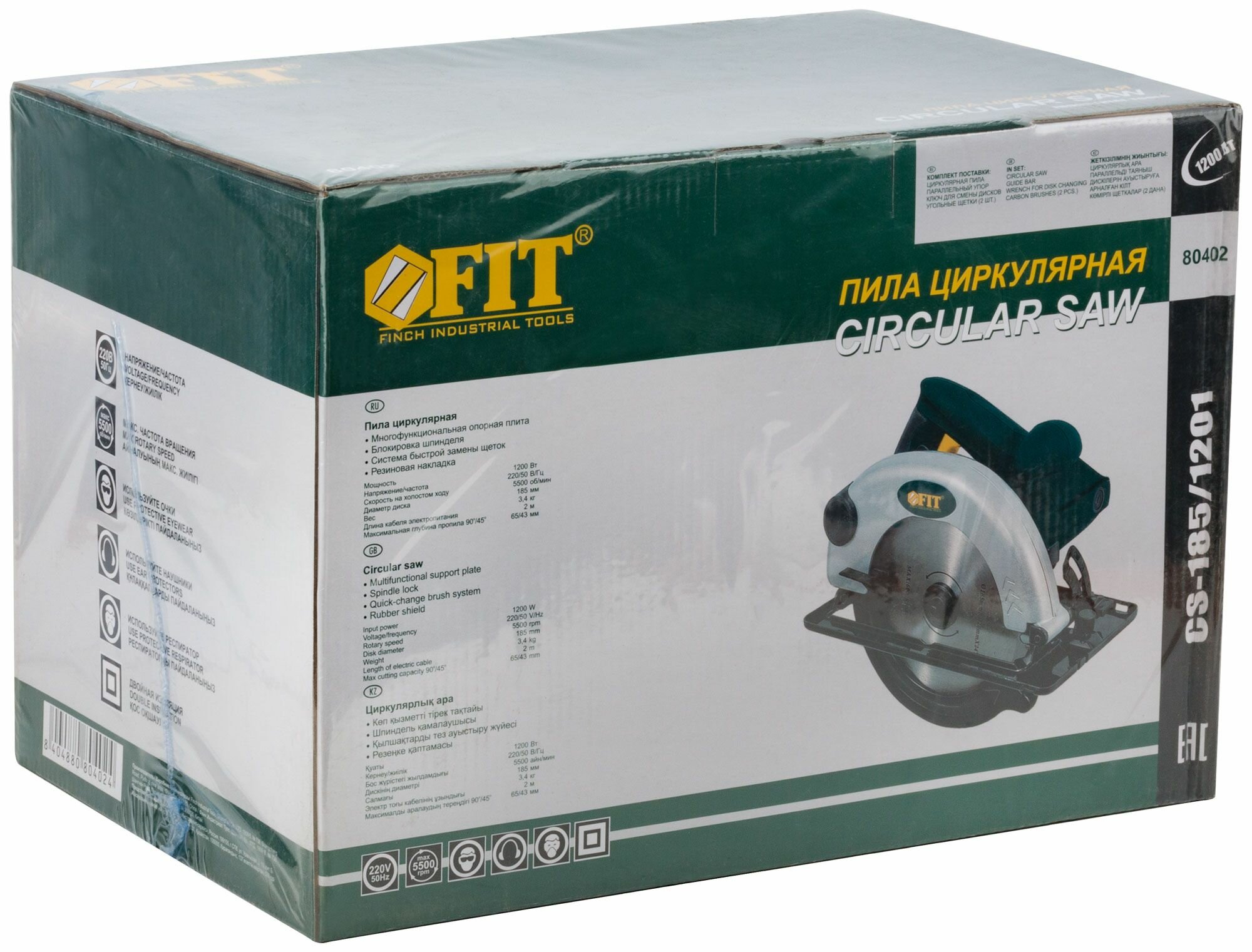 Пила дисковая 1200 Вт; 5000 об/мин; 185/20 мм; жел. опора; рез. накл.; БС щеток; блок шпинд.; коробка FIT 80402 (1 шт.)