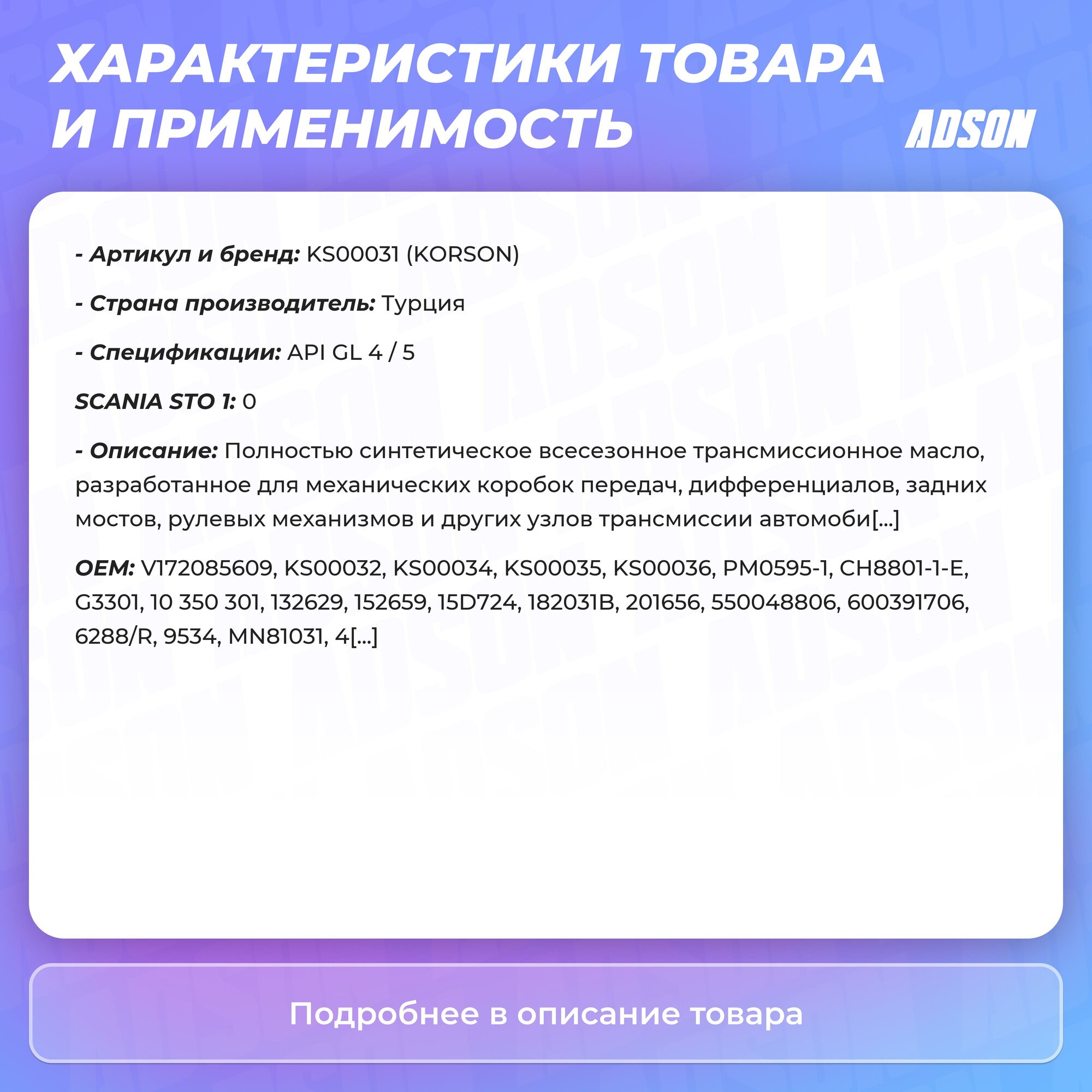 75W-90 Full Synthetic Gl-4/5 1Л (Синт. Транс. Масло.) Korson арт. KS00031 информация: