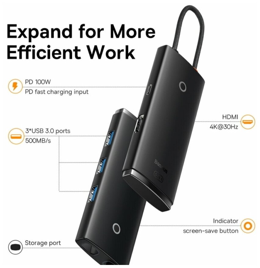 Хаб Baseus Lite Series 6-Port Type-C HUB Docking Station (Type-C to HDMI+USB3,0*2+PD+SD/TF) Black WKQX080301