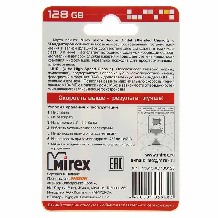 Карта памяти Mirex microSD, 128 Гб, SDXC, UHS-I, класс 10, с адаптером SD (1шт) информация: