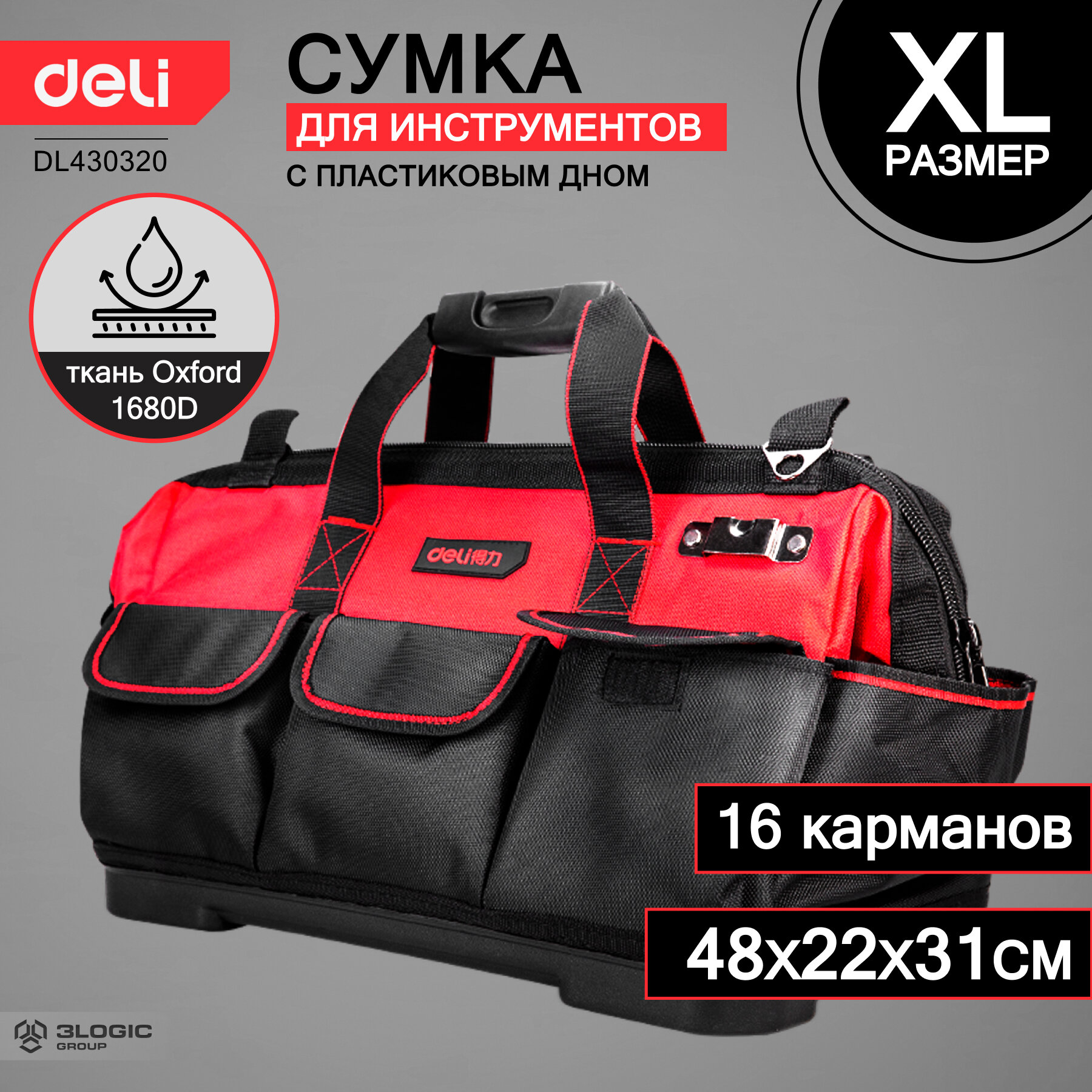Отзывы на Сумка для инструментов с жестким пластиковым дном Deli DL430320 475x220x310мм (16 карманов, плечевой ремень, ткань Оксфорд 1680D, материал EVA)