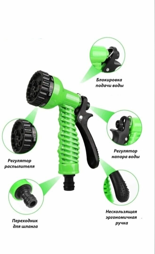 Пистолет для полива/насадка душ на шланг/Поливочный пистолет 7 режимов, 3 переходника, зелёный