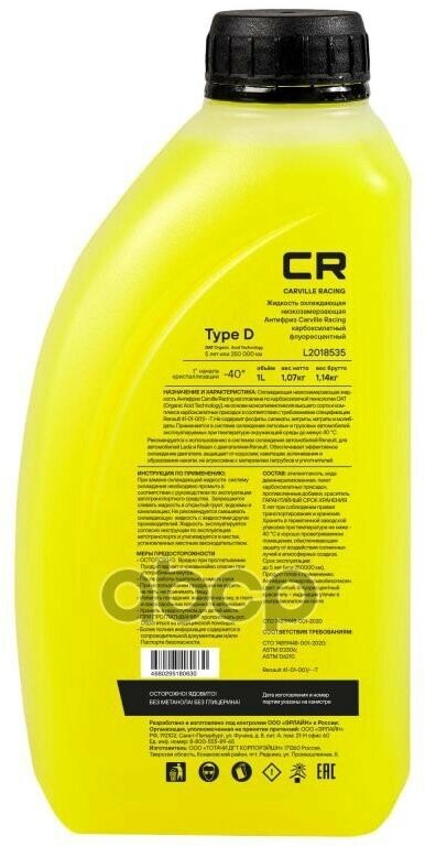 CARVILLE RACING L2018535 Антифриз CARVILLE RACING Type D G12 готовый -40C желтый 1 л L2018535 1шт информация: