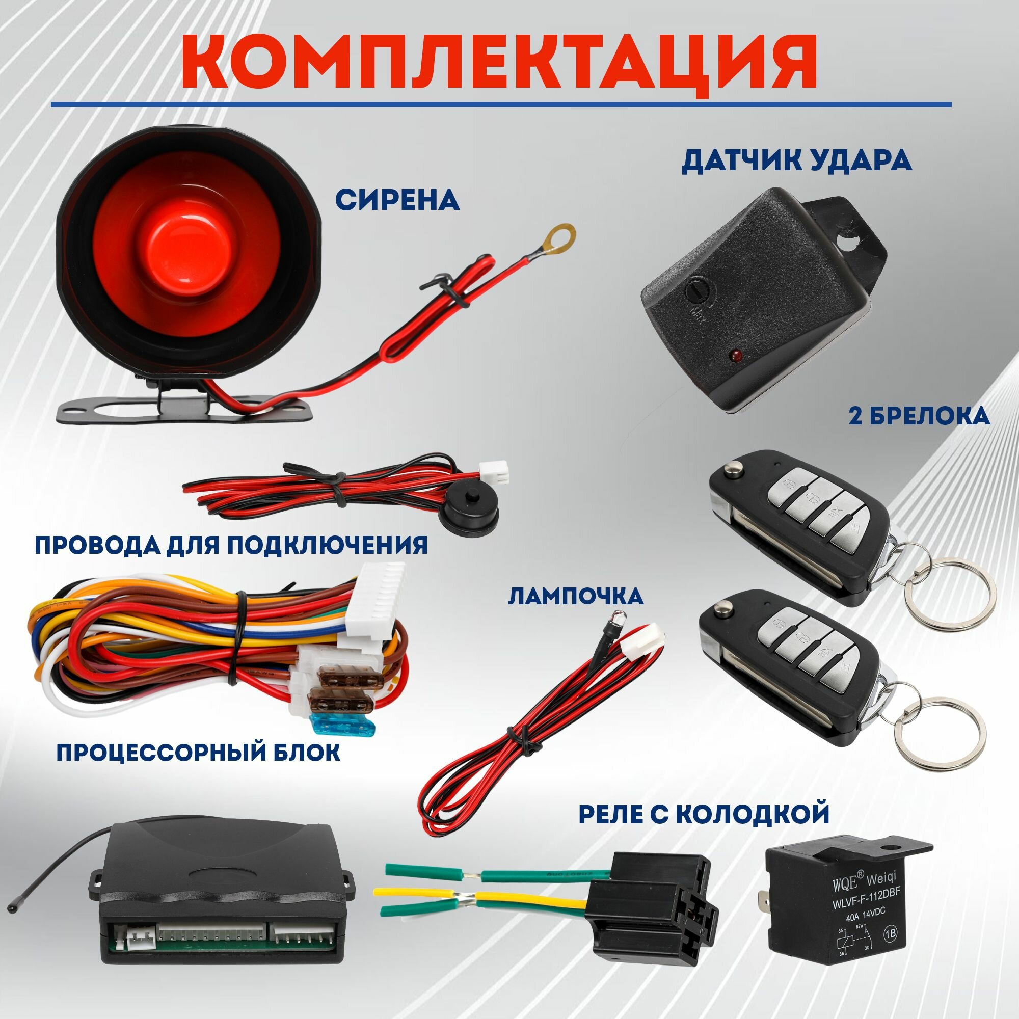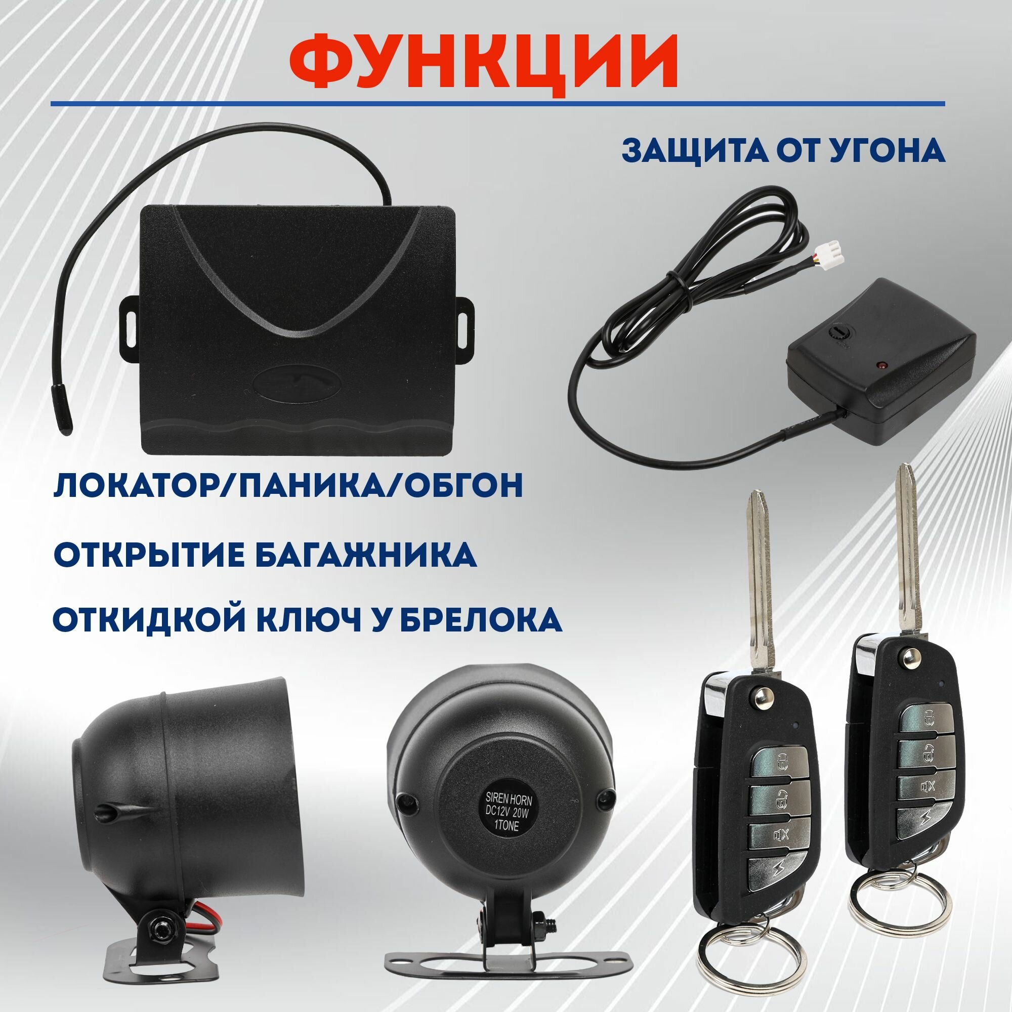 | Подробная комплектация | Сирена, 2 брелока с выкидным ключом, блок, провода |