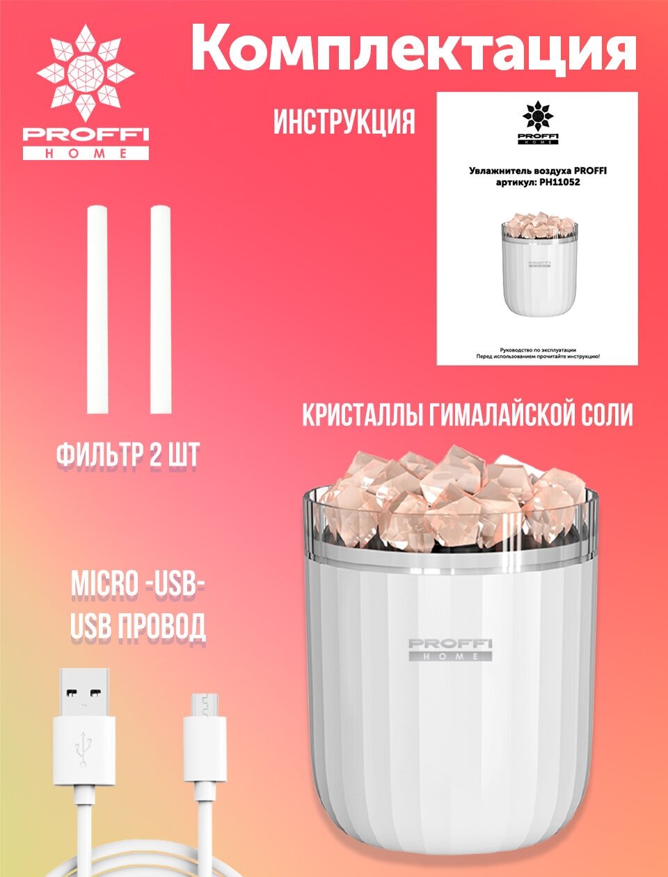 Увлажнитель воздуха для дома с Гималайской солью PROFFI HOME PH11052, ультразвуковой с подсветкой информация: