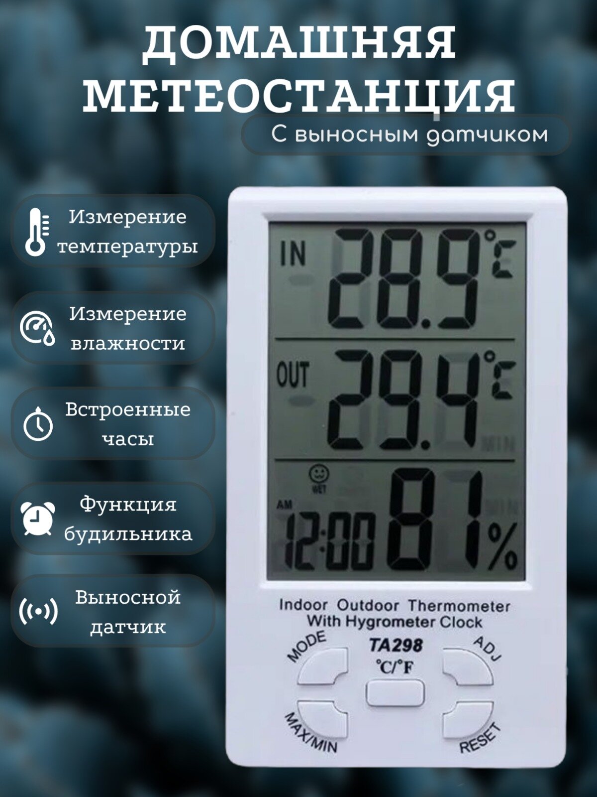 Метеостанция домашняя электронная TA-298, гигрометр термометр комнатный для измерения температуры и влажности воздуха с выносным датчиком информация: