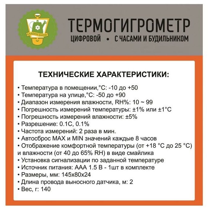 Термометр гигрометр электронный GARDEN SHOW LCD дисплей 83х43х12 мм информация: