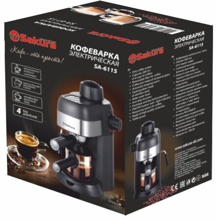 Кофеварка Sakura SA-6115 рожковая 0,25л,4бар,800Вт. информация: