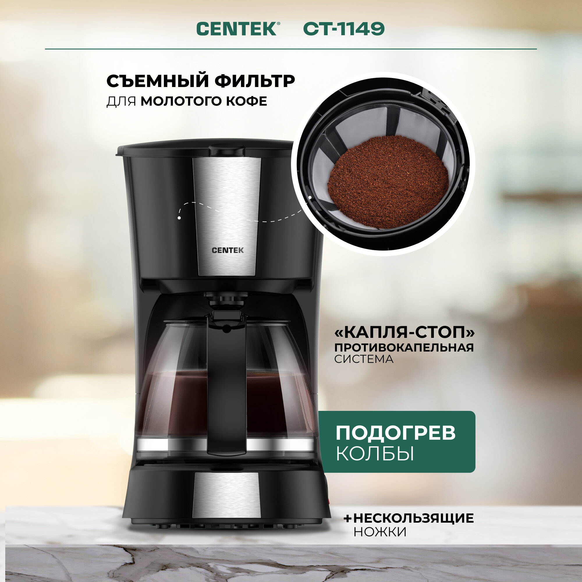 10 цен на Кофеварка капельная CENTEK CT-1149 Steel/Black, 980Вт, на 1,2л