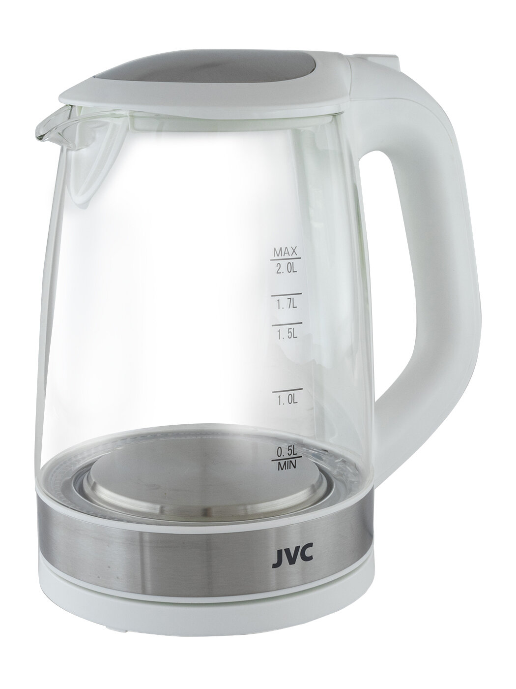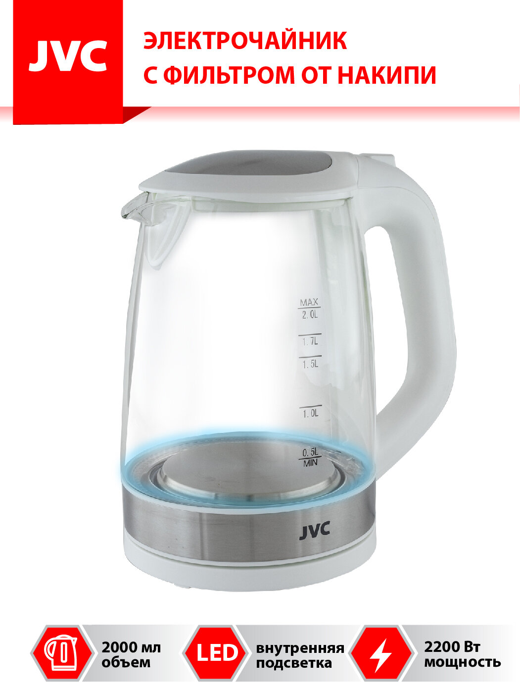 Чайник электрический стеклянный JVC 2 л, открывание крышки кнопкой, индикация включения, 2200 Вт информация: