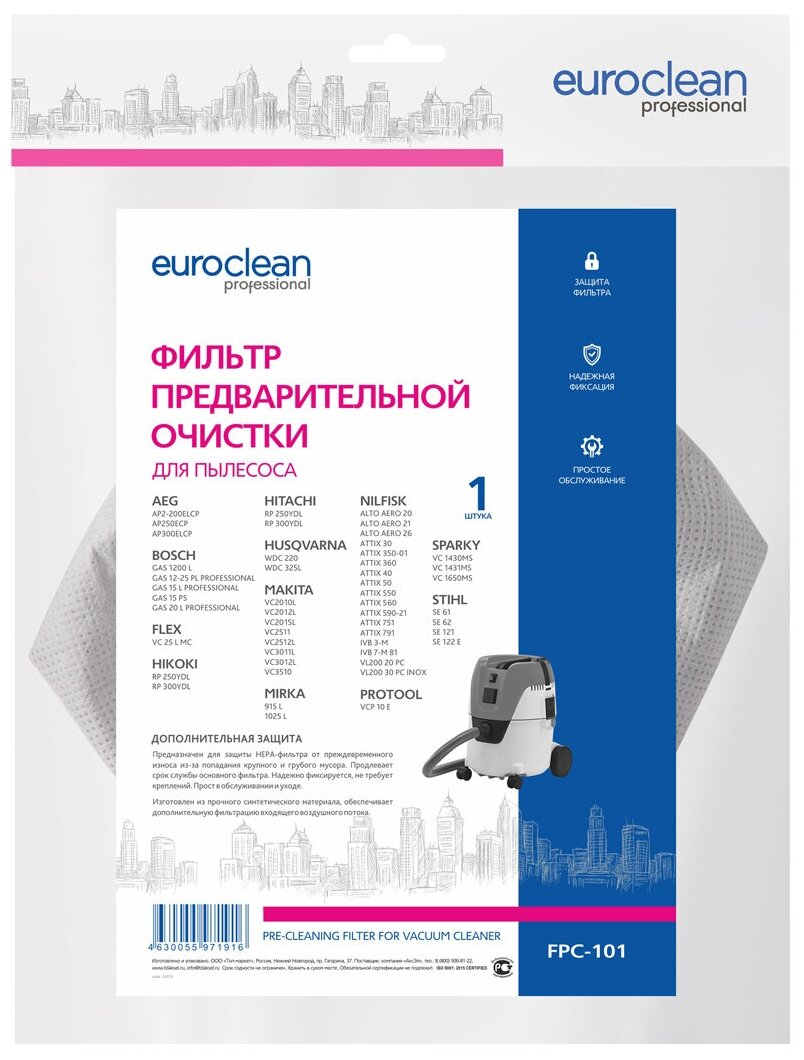 Фильтр предварительной очистки EURO Clean FPC-101 для пылесоса BOSCH GAS 15 MAKITA NILFISK информация: