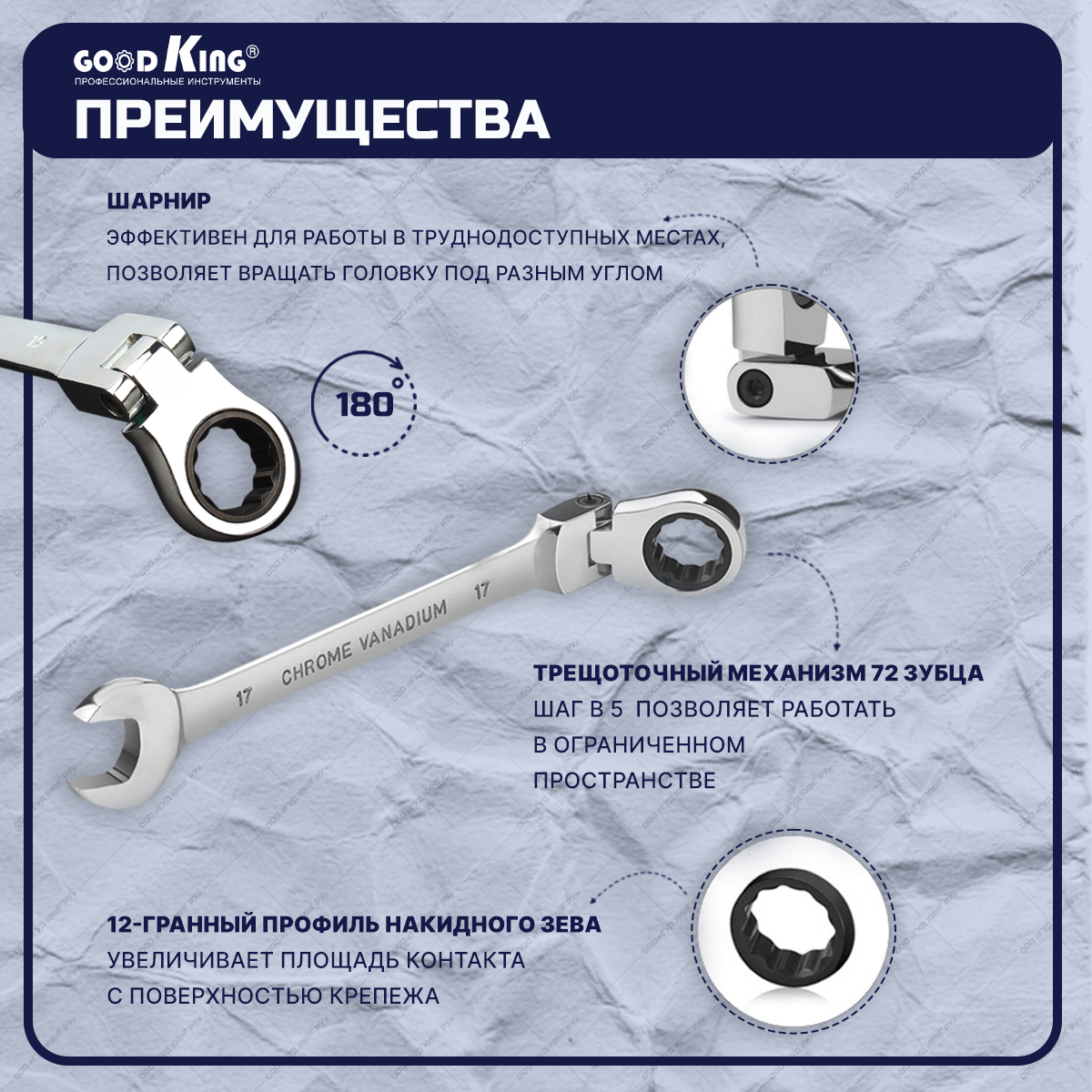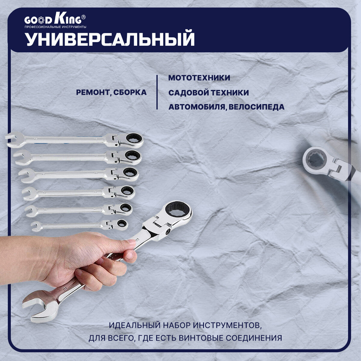10 цен на Набор ключей комбинированных трещоточных шарнирных GOODKING TKS-11006, 6 предметов (8, 10, 12, 13, 14, 17мм) в пластиковом держателе
